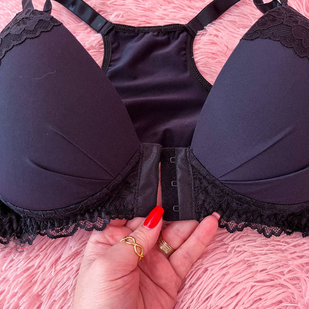 Sutiã nadador com fecho frontal. Rendado e com forro de microfibra, com bojo e aro de sustentação, elástico na base e fecho frontal. Se desejar você pode escolher um modelo de calcinha avulsa para montar conjunto. Basta adicionar no pedido a calcinha na mesma cor do sutiã. Confecção por encomenda e sob medida (pode ser bojo e costas de tamanhos diferentes). Selecione abaixo a cor e o tamanho que gostaria de encomendar, em seguida clique em Adicionar ao carrinho. Para realizar o pedido, clique no ícone do carrinho que se encontra no canto superior direito da tela, confira os modelos escolhidos e depois clique em Finalizar compra pelo whatsapp.