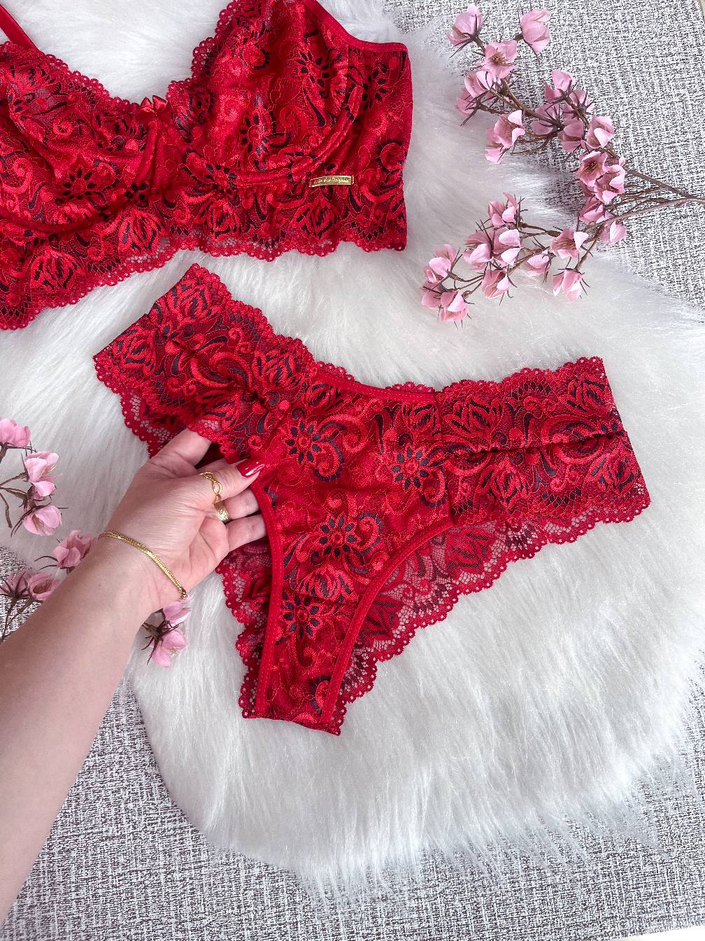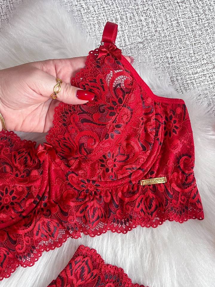 Conjunto rendado, vermelho com detalhes em preto (Edição limitada) Sutiã cropped, forrado nas laterais, sem bojo e com aro de sustentação. Calcinha semi fio de renda, forrada na frente e com fundinho 100% algodão. Para fazer o pedido é só selecionar no menu aqui abaixo a cor e o tamanho que deseja encomendar e adicionar no carrinho (se for pedir mais que uma peça, adicione uma por uma no carrinho). Depois vá para o carrinho e clique no botão: Finalizar compra pelo Whatsapp. Vamos receber um link com o seu pedido e entraremos em contato para fechar a encomenda!