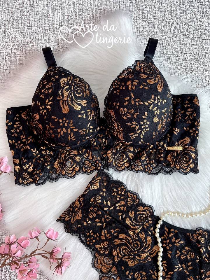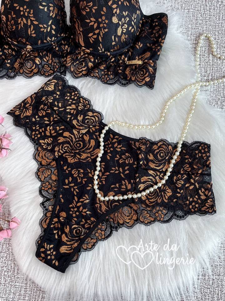 Conjunto com renda bicolor ( preto com detalhes em dourado) Sutiã cropped, com bojo, forrado nas laterais. Calcinha semi fio de renda, forrada na frente e com fundinho 100% algodão. Obs: nos bojos 52 e 54 a renda é só na metade superior do bojo. Para fazer seu pedido selecione logo abaixo a cor e o tamanho que gostaria de encomendar, em seguida clique em Adicionar no carrinho. Depois vá para o carrinho e clique no botão: Finalizar compra pelo Whatsapp.